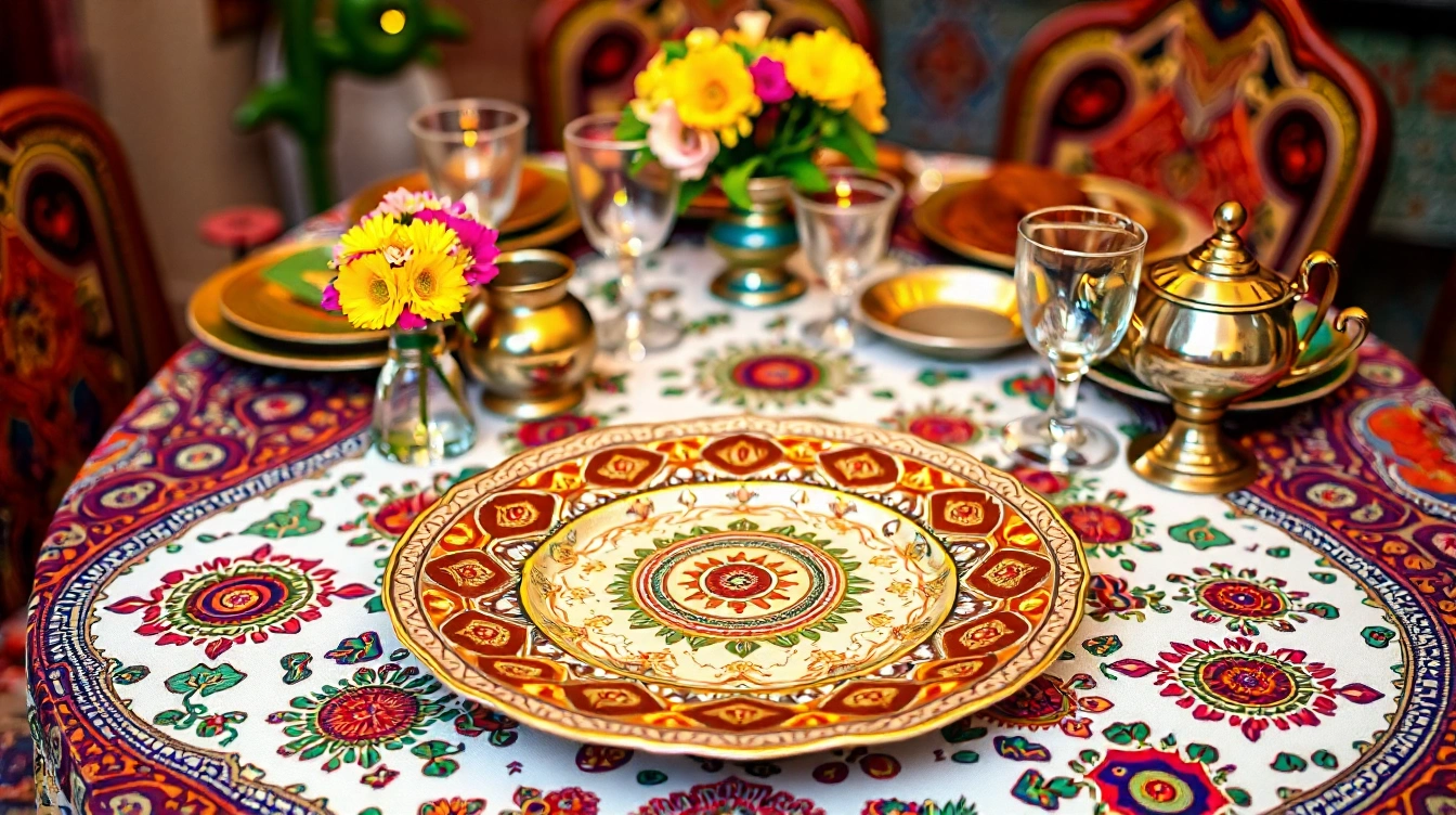 Une belle table pour l'Eid démarre toujours par le choix de votre vaisselle principale. Les assiettes dorées créent immédiatement une atmosphère festive qui correspond parfaitement à l'esprit de célébration de cette fête sacrée. L'or s'associe harmonieusement avec des tons neutres comme le blanc nacré ou le beige, mais aussi avec des couleurs plus audacieuses comme le rouge bordeaux ou le vert émeraude.